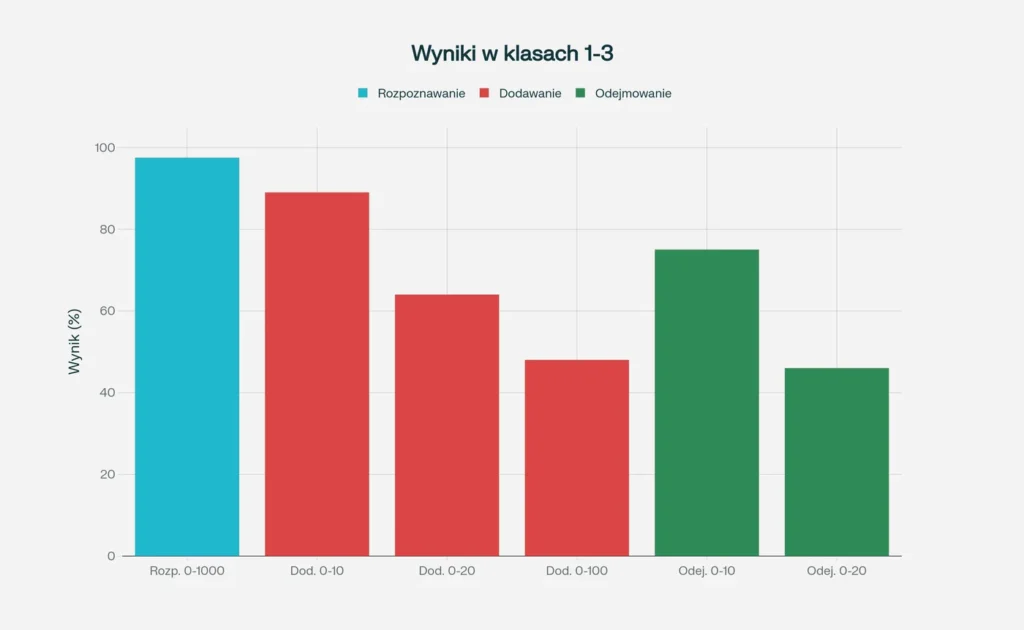 - Dodawanie w zakresie 0-100: 48% (koniec 2 klasy)