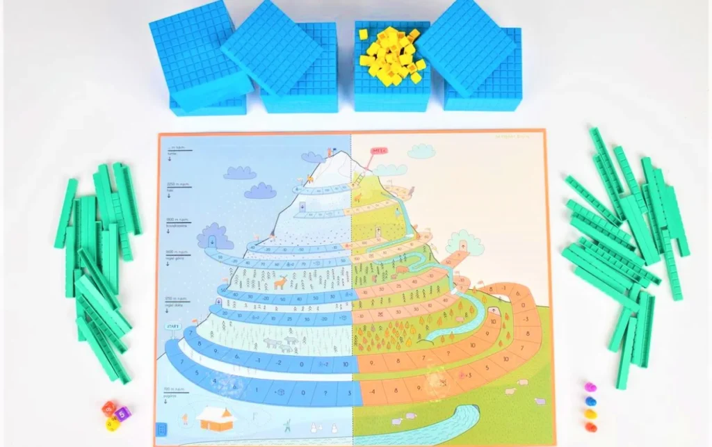 Góra, jest to gra, która w połączeniu z klockami systemu dziesiętnego stanowi kompletny zestaw do nauki operacji na dużych liczbach. Od zawsze największym problemem w nauce dodawania i odejmowania jest przekraczanie progu dziesiątkowego